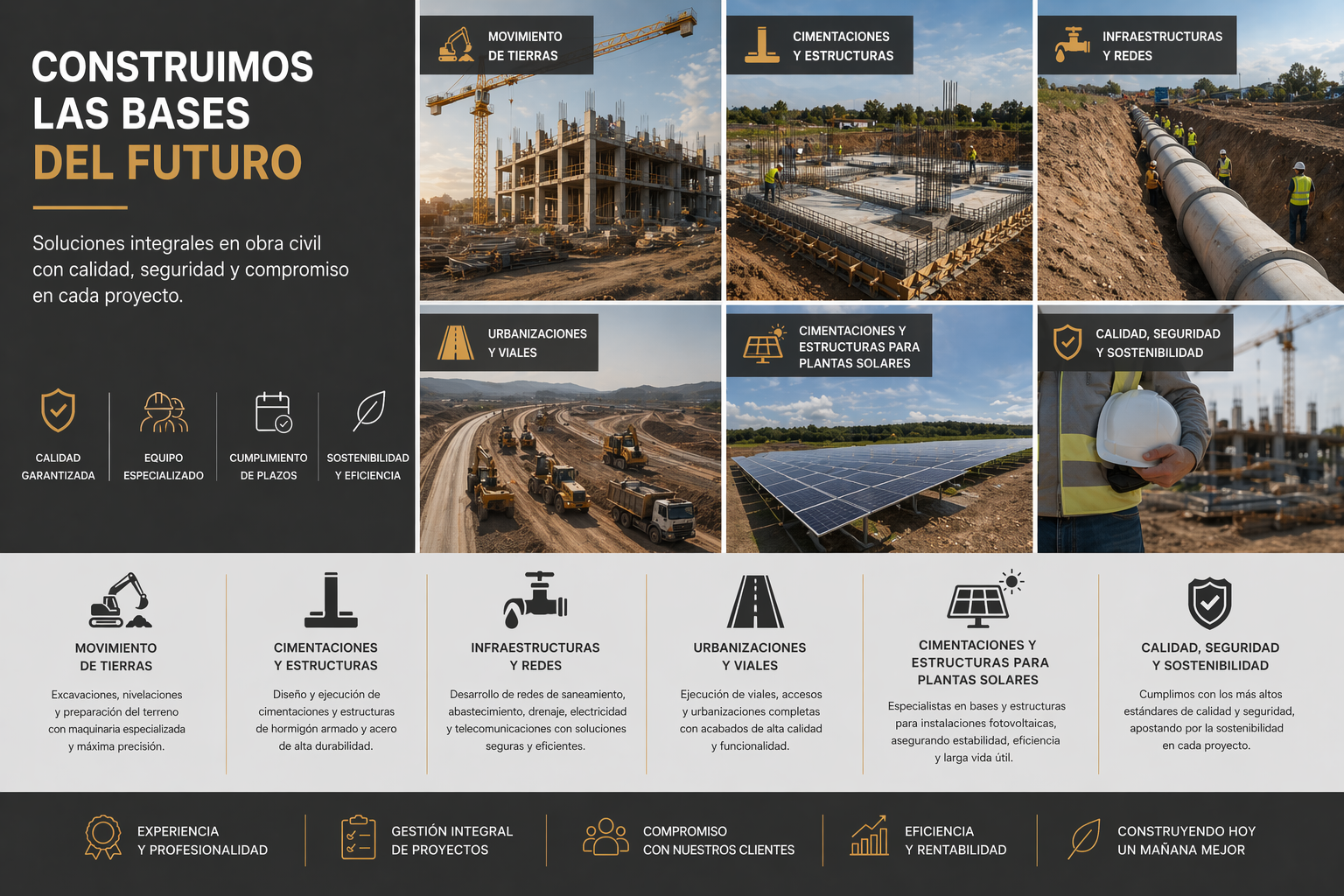 Este departamento se encarga de la planificación, dirección, ejecución y supervisión técnica de obras civiles, abarcando todas las fases del proceso constructivo desde la preparación del terreno hasta la ejecución de cimentaciones, estructuras e infraestructuras básicas, con aplicación en proyectos residenciales, desarrollos urbanísticos, infraestructuras técnicas y soluciones específicas para el sector energético, como bases de cimentación y estructuras para instalaciones fotovoltaicas; nuestro objetivo es garantizar que cada actuación cumpla rigurosamente con los requisitos legales, normativos y de sostenibilidad exigidos, asegurando estabilidad, durabilidad, eficiencia técnica y un alto nivel de calidad en cada proyecto.