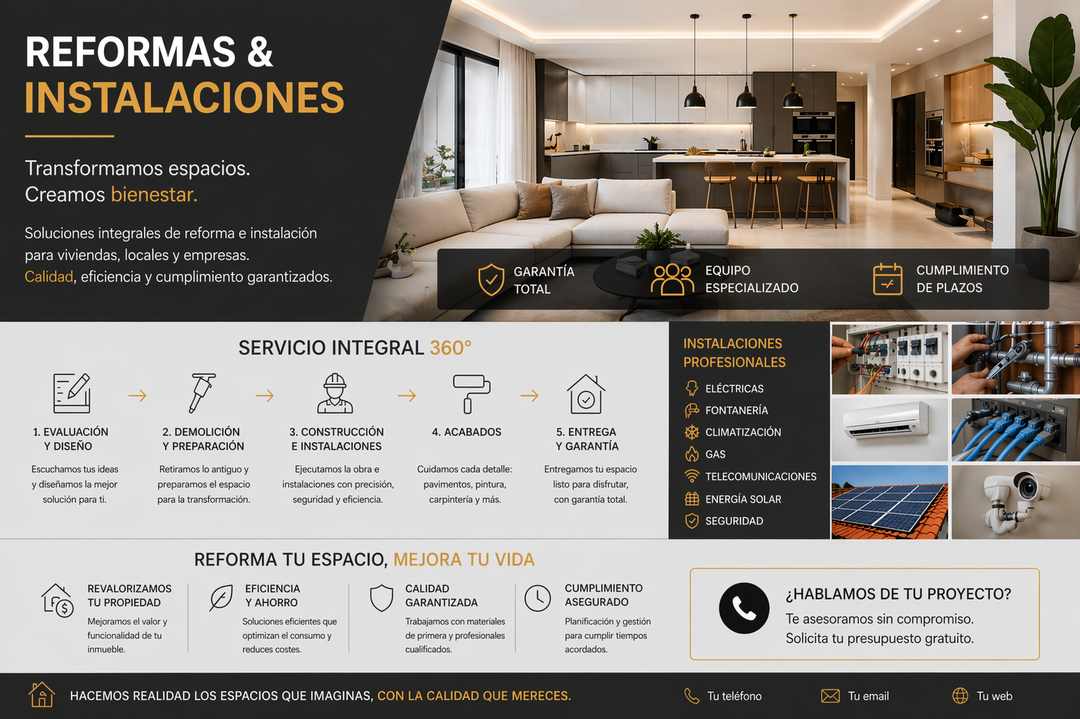 - Reformas integrales y parciales, adaptadas a viviendas, locales comerciales y activos inmobiliarios, con soluciones personalizadas según necesidades del cliente.